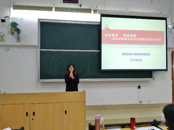 来自越秀区育才实验学校的广州市语文骨干教师陈淑仪,跟同学们分享了以“生长课堂”为理念的实践探索,她就“深度学习、思维课堂”这一主题,结合多个精彩课例向同学们分享了思维成长在语文教学和学习中的重要性。