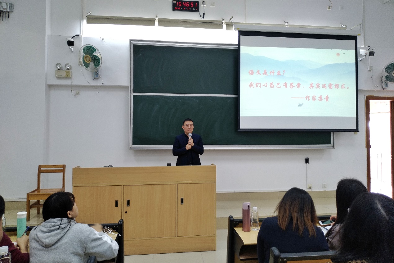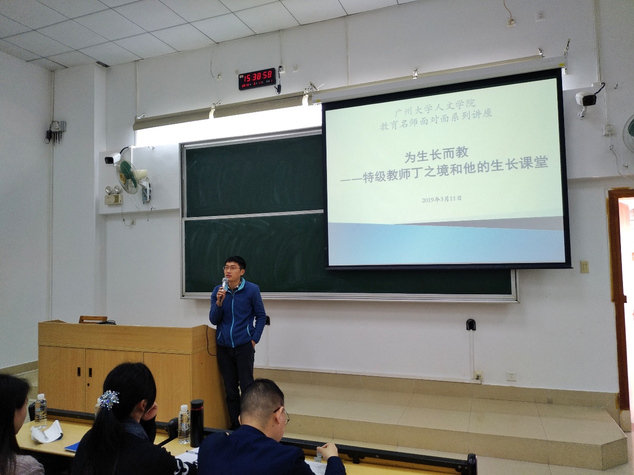 举办的教育名师面对面讲座:“为生长而教——特级教师丁之境和他的生长课堂”。此次讲座的主讲人是广东省实验中学荔湾学校校长、省名师工作室主持人、特级教师丁之境老师。参加人员除了汉语言文学(师范)专业的16级本科生、学科教学(语文)18级研究生、省名师工作室成员以外,还有许多慕名而来的其它年级和外校学生。讲座由语文教育教研室主任林晖老师主持。